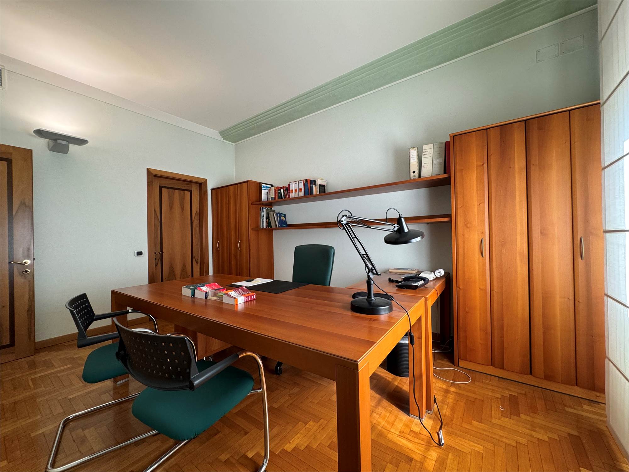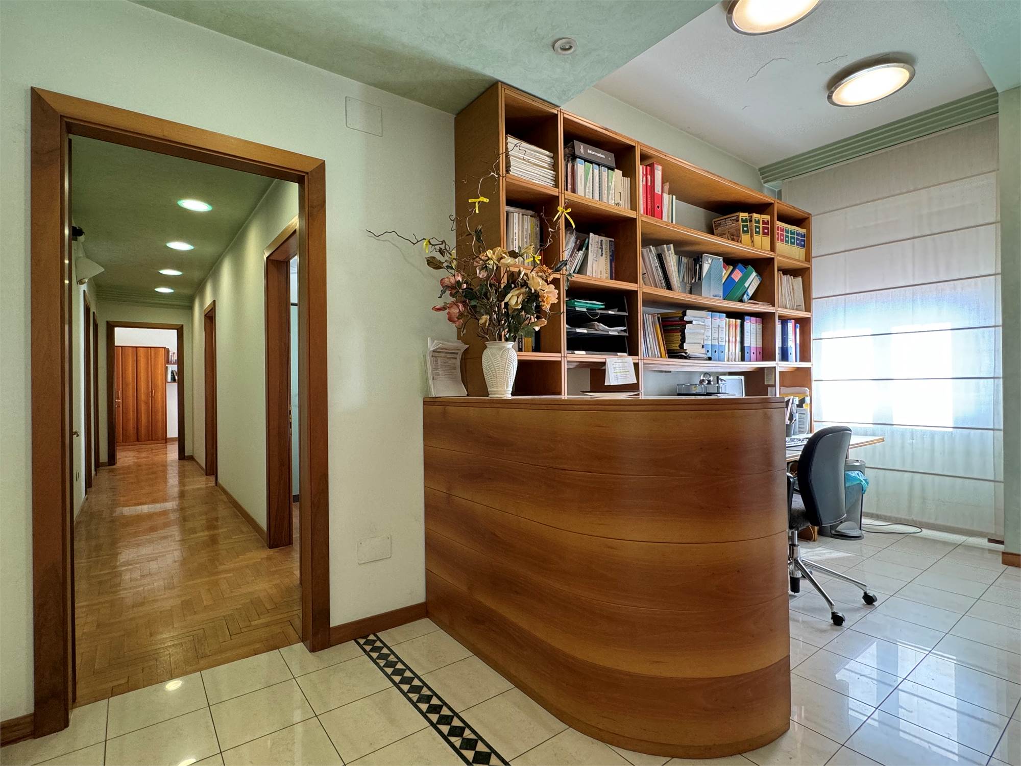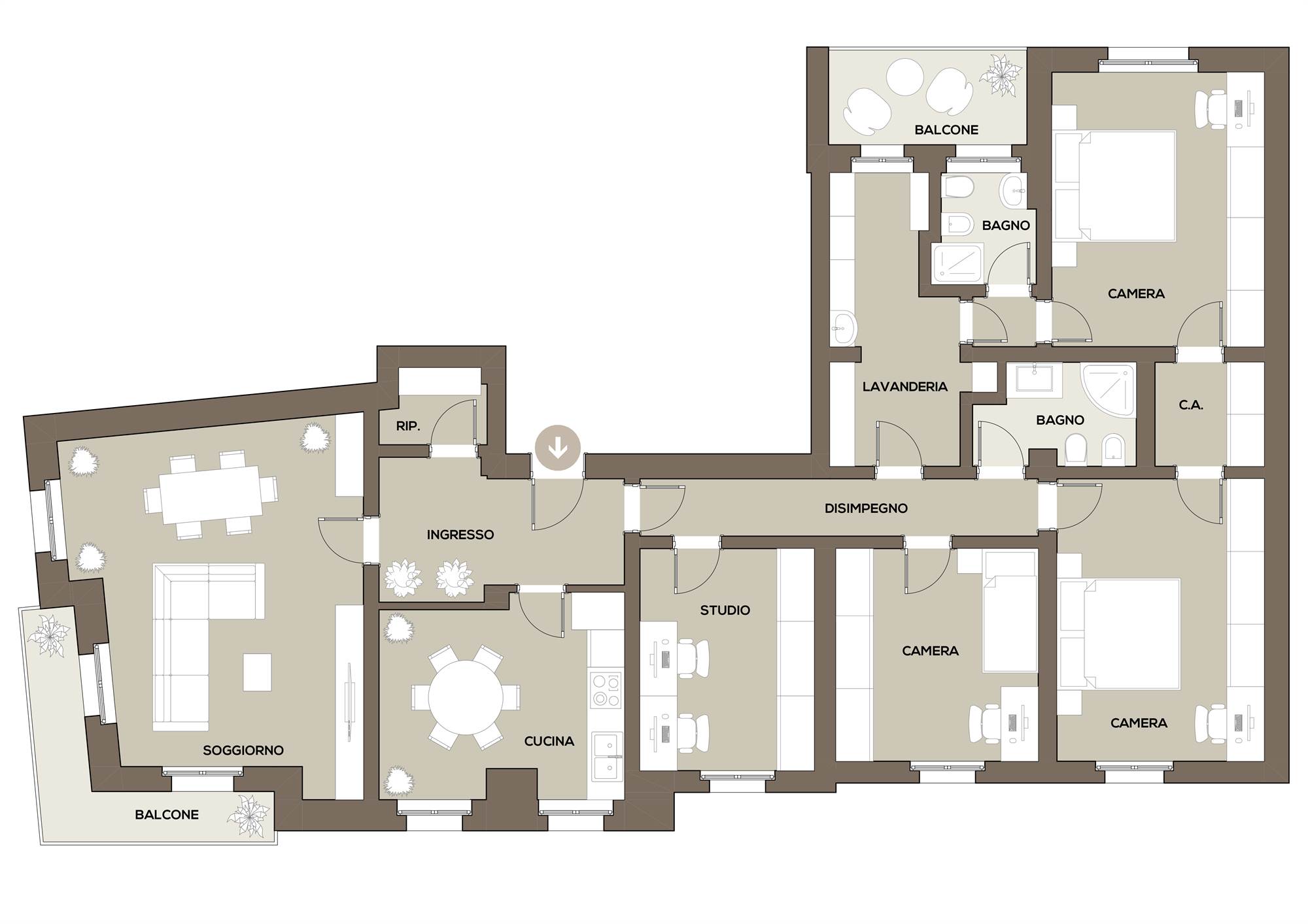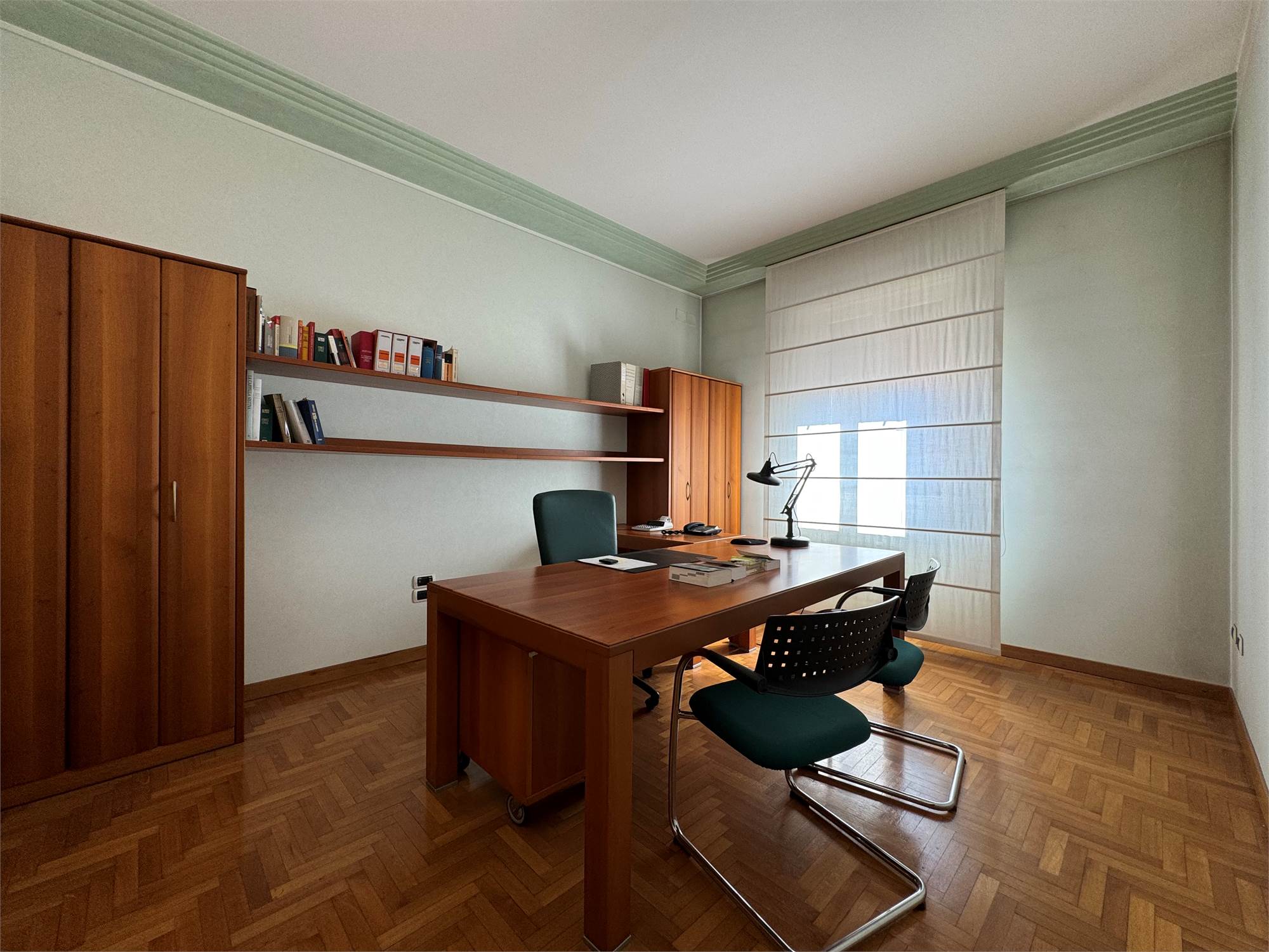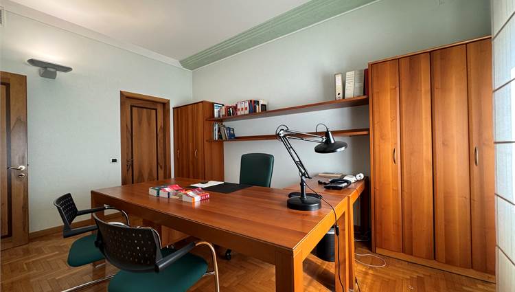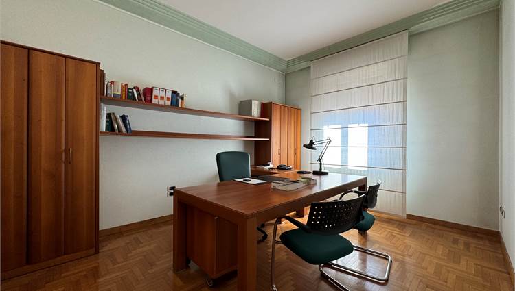 L’immobile è composto da ingresso, cucina, spaziosa zona giorno con balcone, tre camere da letto, studio, due bagni, un ulteriore ambiente attualmente ipotizzato come lavanderia e stireria, altro balcone.